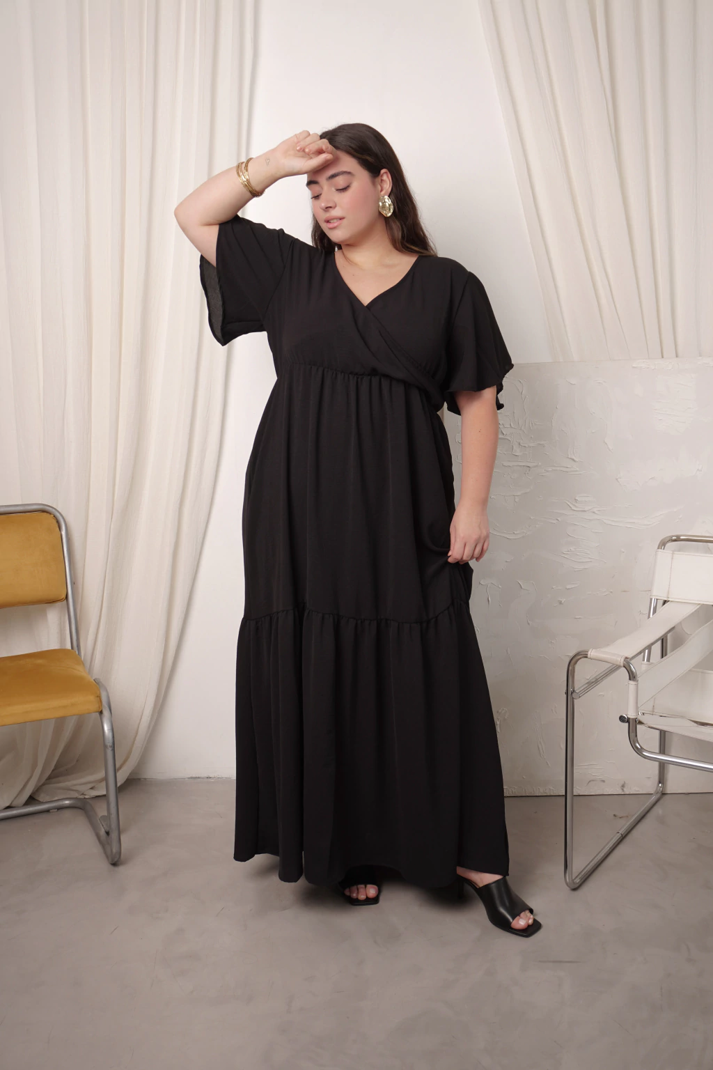 Descripción: Vestido largo escote cruzado con recortes y frunces